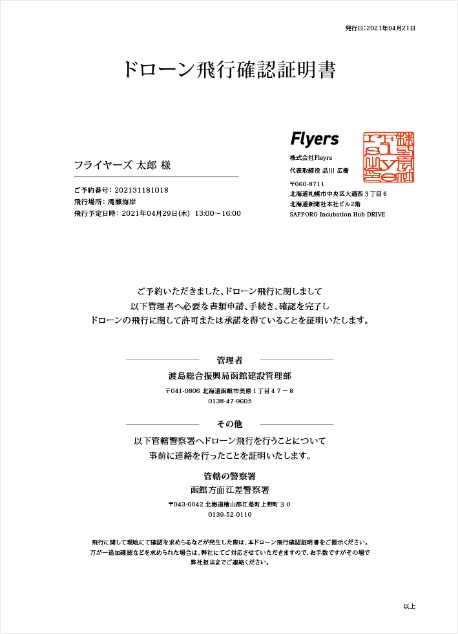 Flyersが確認や連絡を行った管理者情報、管轄の警察署情報は書面として発行します。当日現地でドローンを飛行させている際、第三者に確認を求められた場合などにご利用ください。