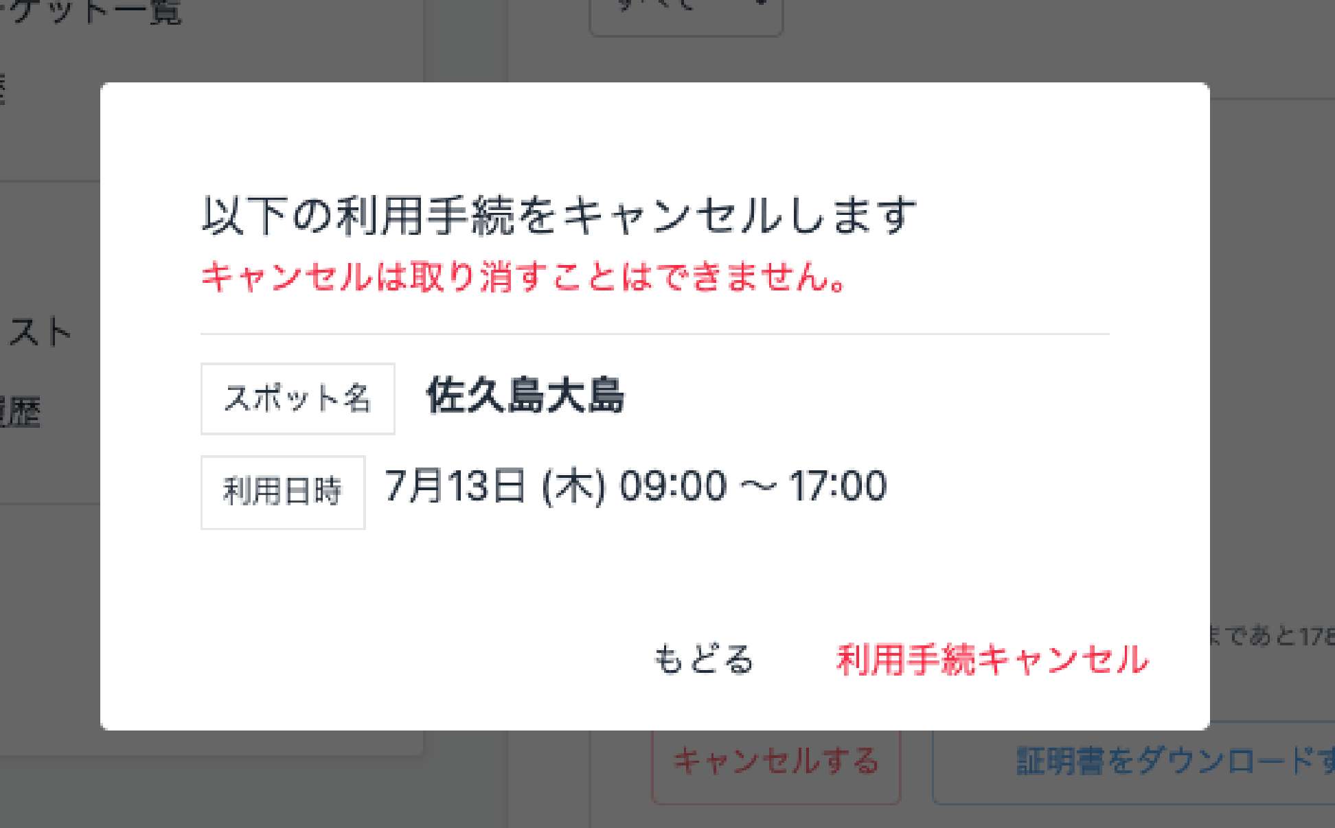 表示されたダイアログの「利用続きキャンセル」を押す